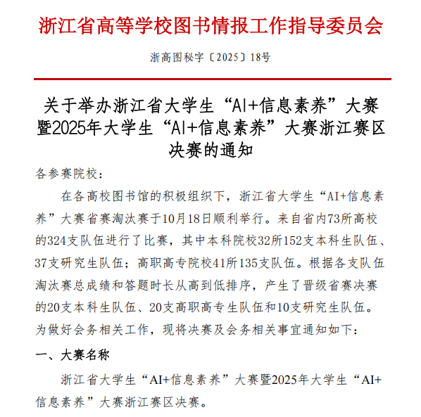 近日,在全省各高校图书馆的联合组织下,2025年全国大学生 “AI + 信息素养” 大赛浙江省赛淘汰赛于10月18日圆满落幕。本次赛事吸引了省内 73 所高校的324支队伍同台竞技,其中高职高专院校 41 所,共派出135支队伍参赛。