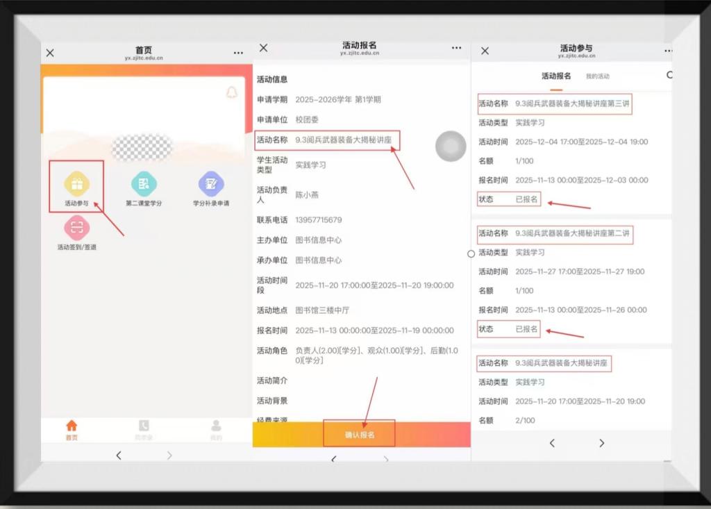 关注工贸青年公众号—>点击发消息,选择学工系统—>登陆后点击热门应用里的学工系统—>选择团委—>点击活动参与—>确认报名“9.3阅兵武器装备大揭秘讲座”活动,状态显示已报名即可。